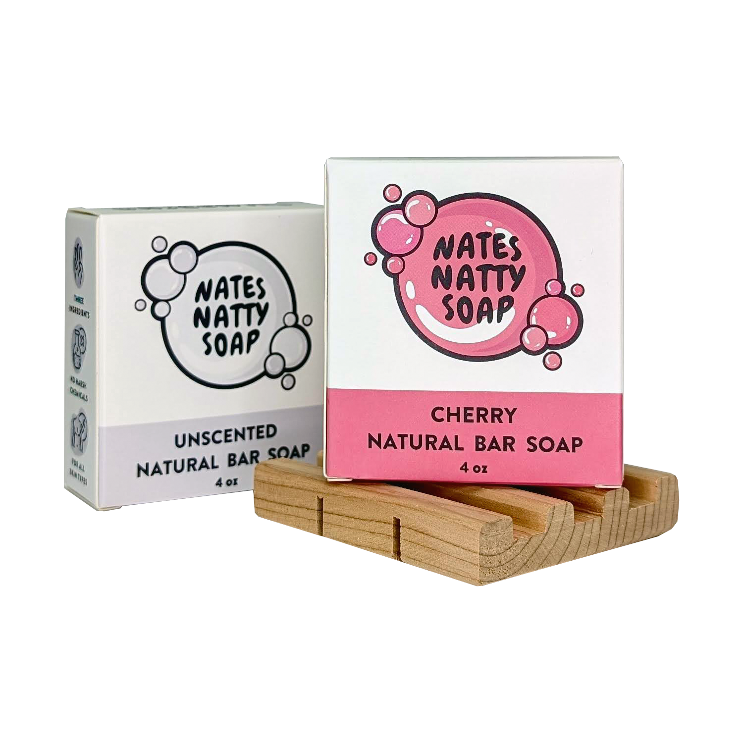This bundle comes with one Cherry bar soap, one Unscented bar soap, and our wooden soap saver tray, giving you everything you need for a dynamic, luxurious lather session.