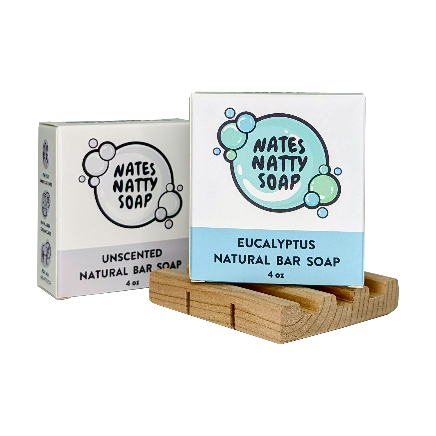 This bundle comes with one Eucalyptus bar soap, one Unscented bar soap, and our wooden soap saver tray, giving you everything you need for a dynamic, luxurious lather session.