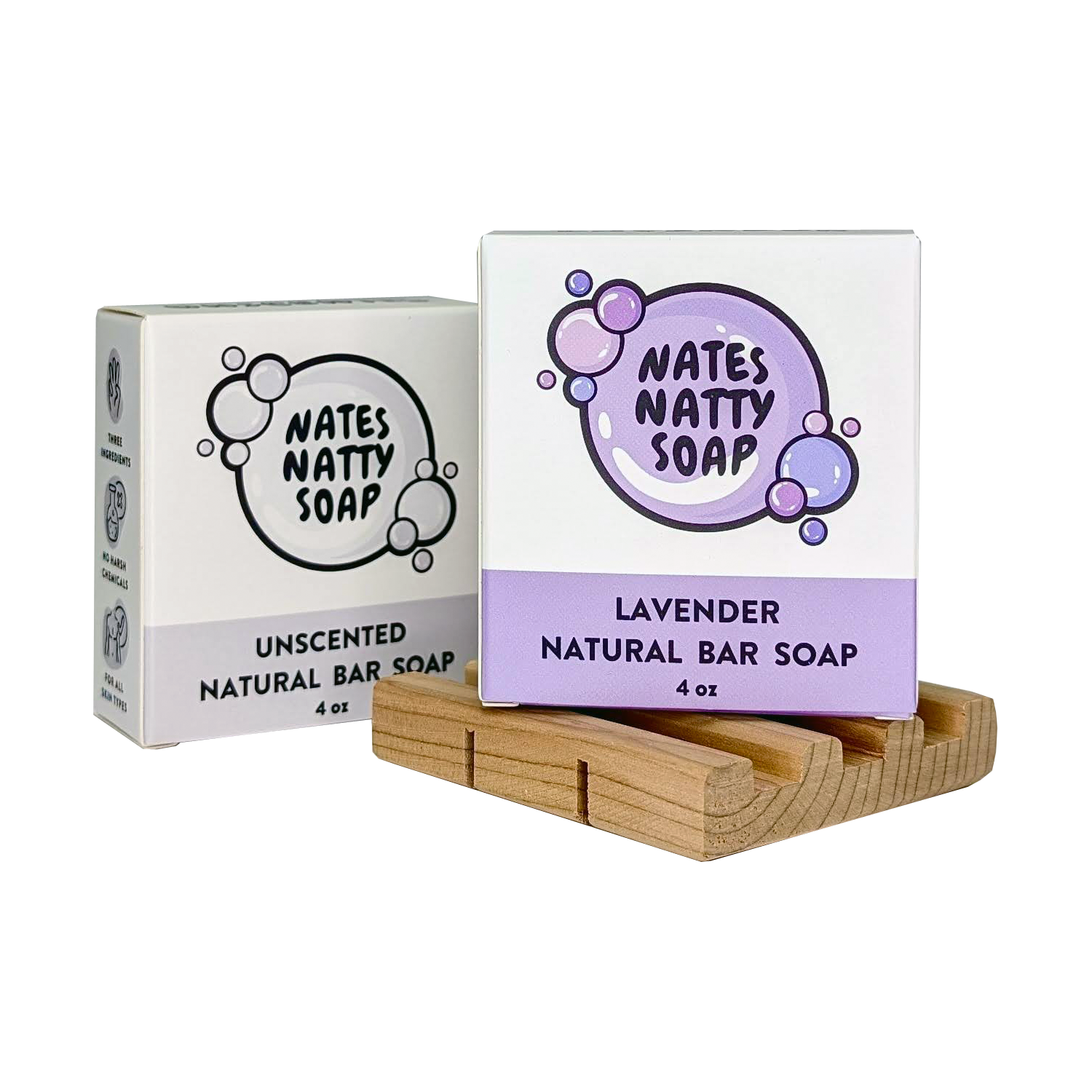 This bundle comes with one Lavender bar soap, one Unscented bar soap, and our wooden soap saver tray, giving you everything you need for a dynamic, luxurious lather session.