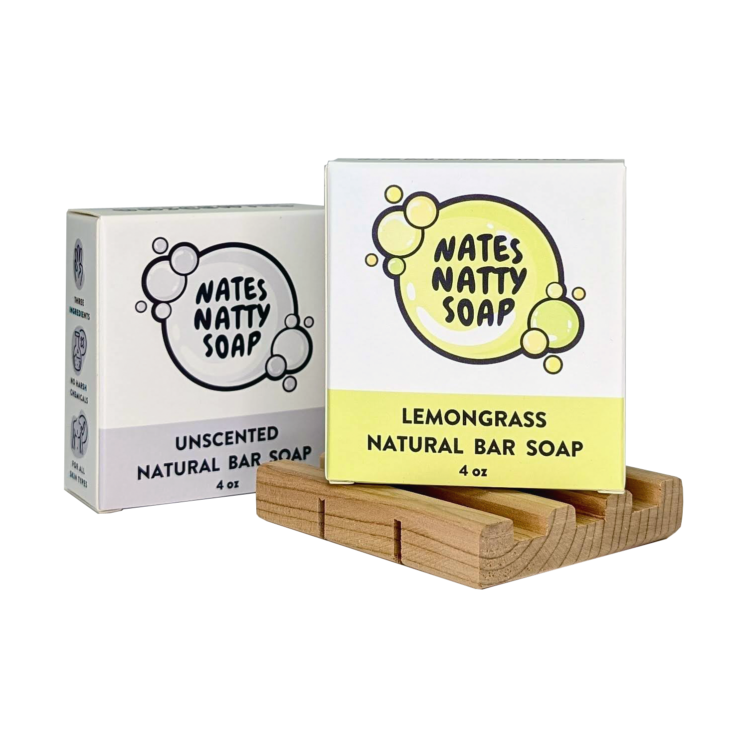 This bundle comes with one Lemongrass bar soap, one Unscented bar soap, and our wooden soap saver tray, giving you everything you need for a dynamic, luxurious lather session.